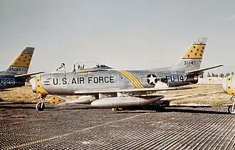 North American F-86F-35-NA Sabre Serial 53-1147 of the 21st FBW. Note the aircraft is parked on temporary steel planking, when the parking apron of Chambley was still unfinished.