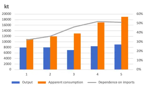 Demand for PX has been increasing due to the rapid development of China's polyester and PTA sectors. However, domestic output has remained rather stagnant. In 2005, China's demand exceeded internal supply by 1.55 million tons and the deficit was met mainly by imports.[6] The country's apparent consumption of PX was 16.572 million tons in 2013, which showed an increase of 19.9% over the previous year. Output was 7.7 million tons, the same as in 2012.[8] From 2010 to 2014, apparent consumption increased by nearly 8 million tons, whilst output only increased by slightly more than 1 million tons.[11]