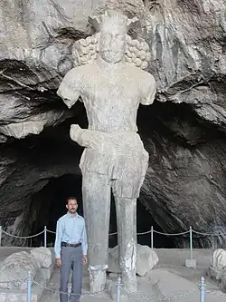 The statue is about 35 m from the cave entrance, on the fourth of five terraces, lying approximately 3.4 m below the level of the cave entrance. Its height of about 6.7 m and breadth across the shoulders of more than 2 m make it one of the most impressive sculptures from the Sassanian period.