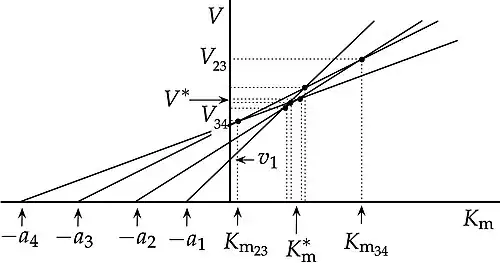 In biochemistry, the direct linear plot is a graphical method for enzyme kinetics data following the Michaelis–Menten equation.[1] In this plot, observations are not plotted as points, but as lines in parameter space with axes and , such that each observation of a rate at substrate concentration is represented by a straight line with intercept on the axis and on the axis. Ideally (in the absence of experimental error) the lines intersect at a unique point whose coordinates provide the values of and .
