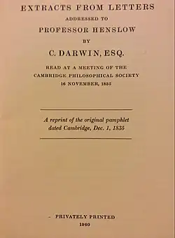 Extracts from Letters to Henslow, taken from ten letters Charles Darwin wrote to John Stevens Henslow from South America during the second survey expedition of HMS Beagle, were read to the Cambridge Philosophical Society on 16 November 1835 by Henslow and Adam Sedgwick, followed on 18 November by geological notes from the letters which Sedgwick read to the Geological Society of London. On 1 December 1835 they were printed as a pamphlet for private distribution.[1]