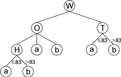 where “H” represents the attribute Humidity, “O” the attribute Outlook, “W” represents Windy, and “a” and “b” the class labels "Yes" and "No" respectively. Note that the edges connecting the nodes are properties of the data, specifying the type and number of branches of each attribute, and therefore don't have to be encoded.