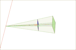 Third, through an equivalent operation, we can find H' to rectify the second image (column 2 of 2D image set). Note that H'1 should rotate the second image's optical axis to be parallel with the transformed optical axis of the first image. One strategy is to pick a plane parallel to the line where the two original optical axes intersect to minimize distortion from the reprojection process.[10] In this example, we simply define H' using the rotation matrix R and initial projective transformation H as .