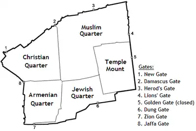 The gate's location is determined by the city's topography. It stands at the point where the valley followed by Jaffa Road meets the city wall at the upper end of the Transversal Valley, which bisects the Old City in a roughly west–east direction, between the northwest ridge and the southwest hill known as Mount Zion.[26][27] Inside the city, there are two streets today that follow the Transversal Valley eastward, down into the Central or Tyropoeon Valley and end at the Temple Mount: David Street, continued by the Street of the Chain.[28] The Transversal Valley with the two streets separates the city into a northern and a southern half, with the Christian and Muslim Quarters to the north, and Armenian and Jewish Quarters to the south.