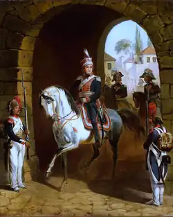Dąbrowski was seen as a cavalry expert, and King Stanisław August Poniatowski was personally interested in obtaining Dąbrowski's services.[8] As a cavalryman educated in a Dresden military school under Count Maurice Bellegarde, a reformer of the Saxon army's cavalry, Dąbrowski was asked to help modernize the Polish cavalry, serving in the ranks of the 1st Greater Poland Cavalry Brigade (1 Wielkpolska Brygada Kawalerii Narodowej).[8] In January 1793, stationed around Gniezno with two units of cavalry, about 200 strong, he briefly engaged the Prussian forces entering Poland in the aftermath of the Second Partition of Poland, and afterwards became a known activist, advocating the continuation of military struggle against the occupiers.[8][21]