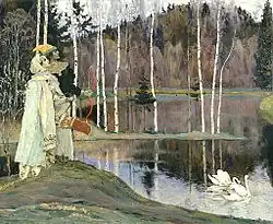 Starting in the 19th century, critical voices began to appear in the scientific community about the authenticity of the deities. One of the first and most influential[20][21] was ethnographer and linguist Alexander Potebnja. After analyzing the source material, mainly song fragments, he came to the conclusion that lada appears in spring, summer and wedding songs, and that there are no grounds to consider this word as a remnant of the old goddess.[22] This position was later upheld by linguists Gregor Kreka and Aleksander Brückner,[21] as well as Max Vasmer[20] and Oleg Trubachyov.[23] Contemporary scholars overwhelmingly reject the authenticity of the deities Lada and Lado, believing, as in the case of Jesza, that the word lada, incomprehensible to the scribe, found in folk songs, was mistakenly considered a theonym, and then its attributes were added. This view is shared by scholars who consider at least part of Długosz's mythological account to be valuable, such as Aleksander Gieysztor,[24] Andrzej Szyjewski,[d] or Vyacheslav Ivanov and Vladimir Toporov.[25]