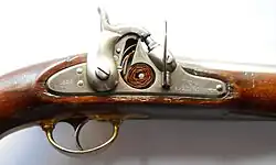 Diagram of a Springfield Model 1855 Musket's lock mechanism. The small plate with the eagle on it is the cover for the Maynard tape system.