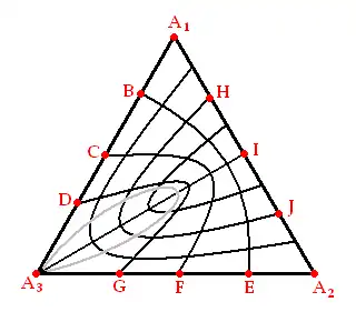 The Morin surface has a quadruple point through which passes its axis of symmetry. This quadruple point is the starting point and the end point of six lines of double points. Each of the quarter sections is bounded by three of these lines of double points, so that each quarter section is homeomorphic to a triangle. Section East is now shown schematically: