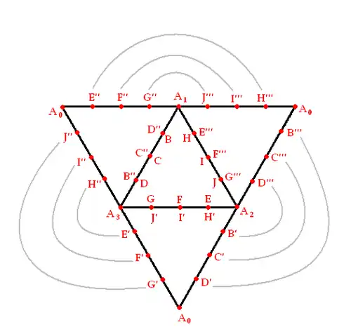 The diagram shows section East bounded by three loops: ABCDA, AEFGA, and AHIJA. The third loop, AHIJA, is a line of double points where section East intersects with itself. Loop ABCDA is only a line of double points when section East is joined to section West, and loop AEFGA is only a line of double points when section East is joined to section South. Point is the quadruple point which is actually the overlapping of four different points: A0, A1, A2, A3.