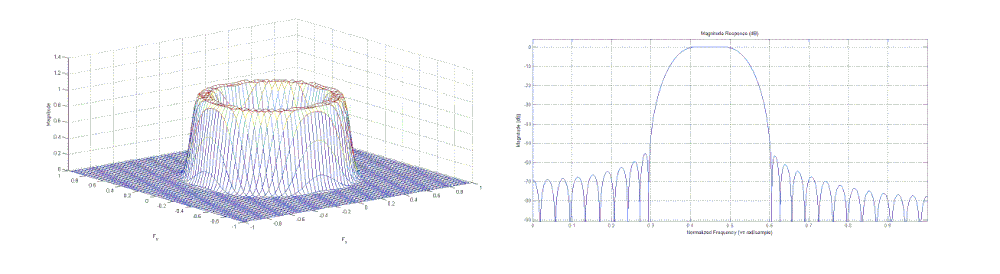 A 2-D filter (left) defined by its 1-D prototype function (right) and a McClellan transformation.
