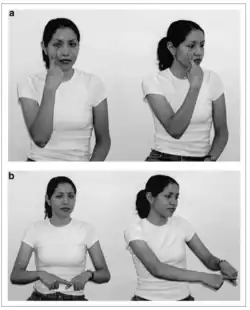 "See" (a) and "Pay" (b), produced in a neutral direction and spatially modulated to the signer's left