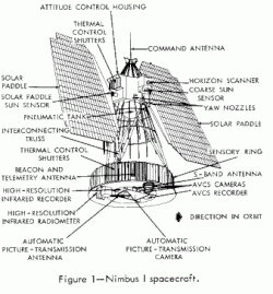 1. ^ a b c d e f g h "Nimbus 1". National Space Science Data Center Master Catalog. NASA Goddard Space Flight Center. Retrieved June 5, 2018. Public Domain This article incorporates text from this source, which is in the public domain.