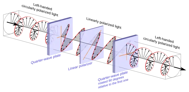 A homogeneous circular polarizer can be created by sandwiching a linear polarizer between two quarter-wave plates.[12] Specifically we take the circular polarizer described previously, which transforms circularly polarized light into linear polarized light, and add to it a second quarter-wave plate rotated 90° relative to the first one.