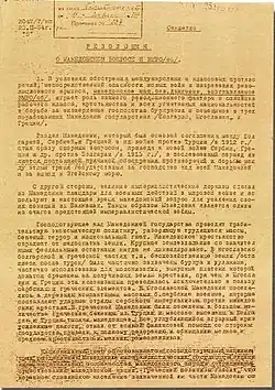 Vlahov mentioned that the resolution had a hostile reception both from members of the Bulgarian Communist Party and of the IMRO (United), residing in Moscow.[26] The Resolution did not ever mention Vlahov as a leader of the IMRO (United).[27] At the meeting where the resolution was adopted, due to the negative reactions to it by the majority of Bulgarian communists present, fears were expressed that it would cause many left-wing Macedonian revolutionaries to switch to Ivan Mihailov's "fascist" and anti-communist IMRO.[23][28] Following the decision of the Comintern, IMRO (United) took as its slogan "the right of the Macedonian people to self-determination up to secession from the oppressor state" and formation of "united independent Macedonian Republic of working people." Despite the fact that this was formally a Resolution of IMRO (United), as it was a document drafted by it, and adopted by the Comintern.[29] Afterwards the mainstream Bulgarian and Greek political opinion has maintained that the Comintern is the "inventor" of the idea about the existence of a separate Macedonian nation.[30] This notion is essentially an absurdity, since the Comintern reflected the discourse of the Macedonian communists and other leftists, who were already making a clear separation between Macedonians and Bulgarians.[31] Dimitar Vlahov in his memoirs confirmed that the national emancipation of the left-wing and communist Macedonian activists has certainly shaped the formula blessed by the Comintern. Hence, one cannot speak of a purely communist invention with no connection to reality.[21]