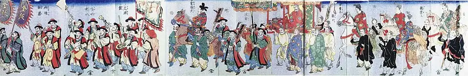 The Ryukyuan king was a vassal of the Satsuma daimyō, after Shimazu's Ryukyu invasion in 1609, the Satsuma Clan established a governmental office's branch known as Zaibankaiya (在番仮屋) or Ufukaiya (大仮屋) at Shuri in 1628, and became the base of Ryukyu domination for 250 years, until 1872.[36] The Satsuma Domain's residents can be roughly compared to a European resident in a protectorate.[37] However, the kingdom was not considered as part of any han (fief): up until the formal annexation of the islands and abolition of the kingdom in 1879, the Ryukyus were not truly considered de jure part of Edo Japan. Though technically under the control of Satsuma, Ryukyu was given a great degree of autonomy, to best serve the interests of the Satsuma daimyō and those of the shogunate, in trading with China.[35] Ryukyu was a tributary state of China, and since Japan had no formal diplomatic relations with China, it was essential that China not realize that Ryukyu was controlled by Japan. Thus, Satsuma—and the shogunate—was obliged to be mostly hands-off in terms of not visibly or forcibly occupying Ryukyu or controlling the policies and laws there. The situation benefited all three parties involved—the Ryukyu royal government, the Satsuma daimyō, and the shogunate—to make Ryukyu seem as much a distinctive and foreign country as possible. Japanese were prohibited from visiting Ryukyu without shogunal permission, and the Ryukyuans were forbidden from adopting Japanese names, clothes, or customs. They were even forbidden from divulging their knowledge of the Japanese language during their trips to Edo; the Shimazu family, daimyōs of Satsuma, gained great prestige by putting on a show of parading the King, officials, and other people of Ryukyu to and through Edo. As the only han to have a king and an entire kingdom as vassals, Satsuma gained significantly from Ryukyu's exoticness, reinforcing that it was an entirely separate kingdom.