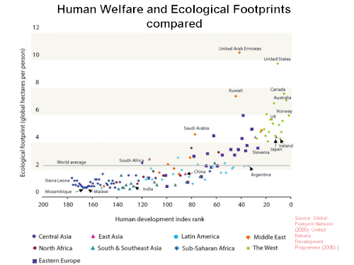 Ecological footprint for different nations compared to their Human Development Index (2007)