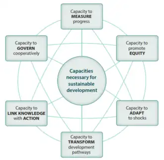 Six interdependent capacities are deemed to be necessary for the successful pursuit of sustainable development.[38] These are the capacities to measure progress towards sustainable development; promote equity within and between generations; adapt to shocks and surprises; transform the system onto more sustainable development pathways; link knowledge with action for sustainability; and to devise governance arrangements that allow people to work together.[39]