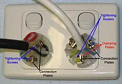 However, with the clamping plate type of screw terminal this time is reduced, since it is necessary only to insert the stripped wire between the terminal and the rear clamping plate then tighten the connection, using the screw to clamp the wire between the terminal and the clamping plate, without any need properly to wrap it around the screw head.