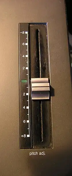 A variable speed pitch control (or vari-speed) is a control on an audio device such as a turntable, tape recorder, or CD player that allows the operator to deviate from a standard speed (such as 33, 45 or even 78 rpm on a turntable), resulting in adjustments in pitch.[1] The latter term "vari-speed" is more commonly used for tape decks, particularly in the UK. Analog pitch controls vary the voltage being used by the playback device; digital controls use digital signal processing to change the playback speed or pitch. A typical DJ deck allows the pitch to be increased or reduced by up to 8%, which is achieved by increasing or reducing the speed at which the platter rotates.
