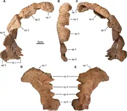 The skull frill of Wendiceratops was broad. The front side of the frill was formed by the squamosal bone which had a rectangular shape. To its edge four skin ossifications or osteoderms were attached, the episquamosals. They had an asymmetrical triangular shape. Uniquely, they curled upwards. From the position of the fourth, frontmost, episquamosal a relatively high ridge was running to the inside, adorned with three substantial bumps. In cross-section, this ridge gave the squamosal the typical "stepped" centrosaurine profile. The rear of the frill consisted of the rounded parietal bones. They too had osteoderms attached to their edges, in this case called epiparietals. Each parietal had five of them, conventionally numbered "p1" to "p5". The fifth and fourth epiparietals, the ones in front, resembled the episquamosals. However, more to the back the epiparietals became increasingly wider, longer and thicker, curving upwards and to the front. This resulted in the first epiparietal becoming tongue-shaped and overhanging a large part of the frill, slightly pointing outwards. In this area the frill edge continued the curvature of these osteoderms, concavely curling upwards. Close to the edge two paired large openings were present, the parietal fenestrae. As no complete frill has been found, their exact form is uncertain but they probably were shaped like transversely oriented ovals. These openings were separated by a broad bone bar which featured a midline ridge that was rather smooth, not adorned by bumps. The bar ended at a gentle embayment of the frill rear edge. This lacked a central epiparietal or "p0".[1]